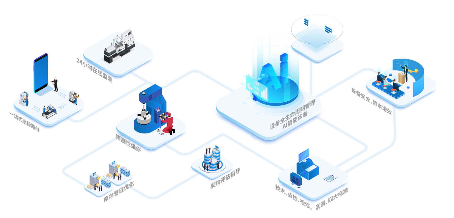 钢铁行业制造装备种类繁多、工艺过程极为复杂、检维修困难,是典型的混合型制造企业。智能运维大数据云平台构将先进设备管理思想、模式、方法导入到设备管理中,使常规检查、精密诊断以及设备的状态监测和劣化分析等统一起来,形成智能化设备大健康管理模式。