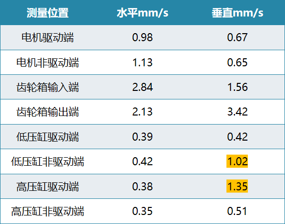 2月18月下午,航天智控诊断工程师现场进行诊断发现高压缸驱动端和低压缸非驱动端连接位置振动值比较大。具体测量结果如下: