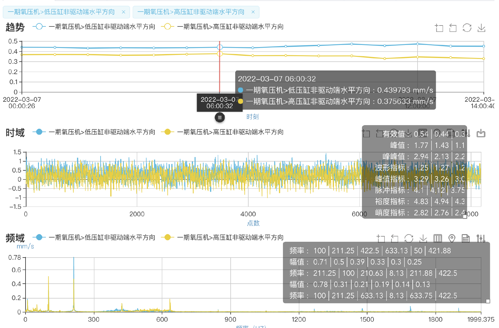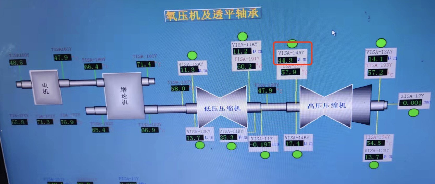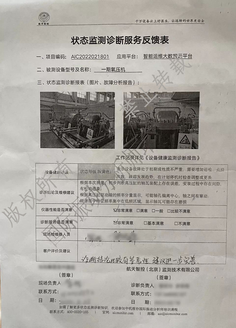 现场维修结束,开始试运行,发现设备高压缸输入端振动值异常;航天智控专家现场测量该设备,出具《氧压机健康监测诊断报告》。