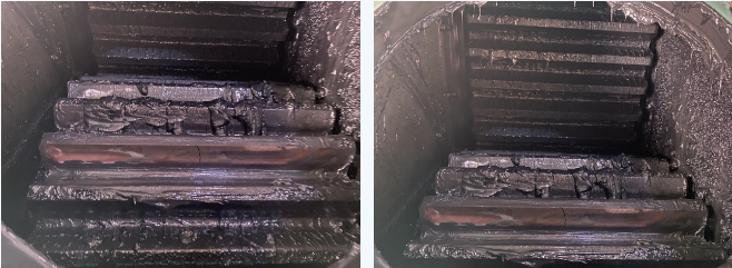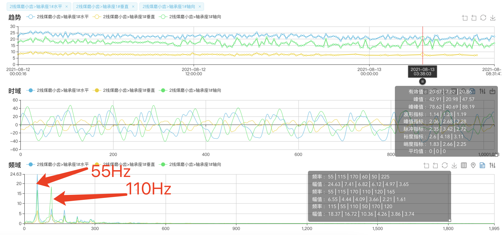 根据频谱图判断,设备振动值趋势比较稳定,但是驱动端轴承座的水平振动值达到25mm/s左右,轴向振动值也在20mm/s左右;频域图、水平方向特征频率主要集中在55hz,55hz为齿轮啮合频率的一倍频,轴向方向特征频率主要集中在110hz;110hz为齿轮啮合频率的二倍频。