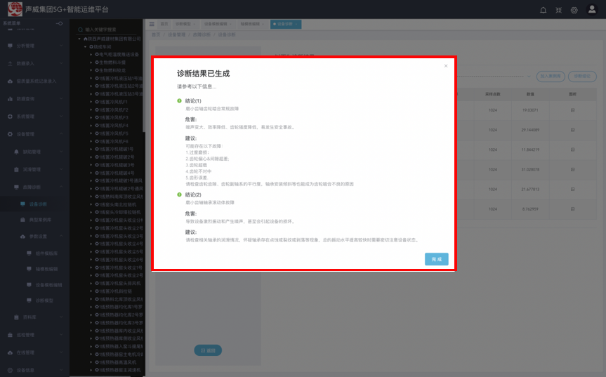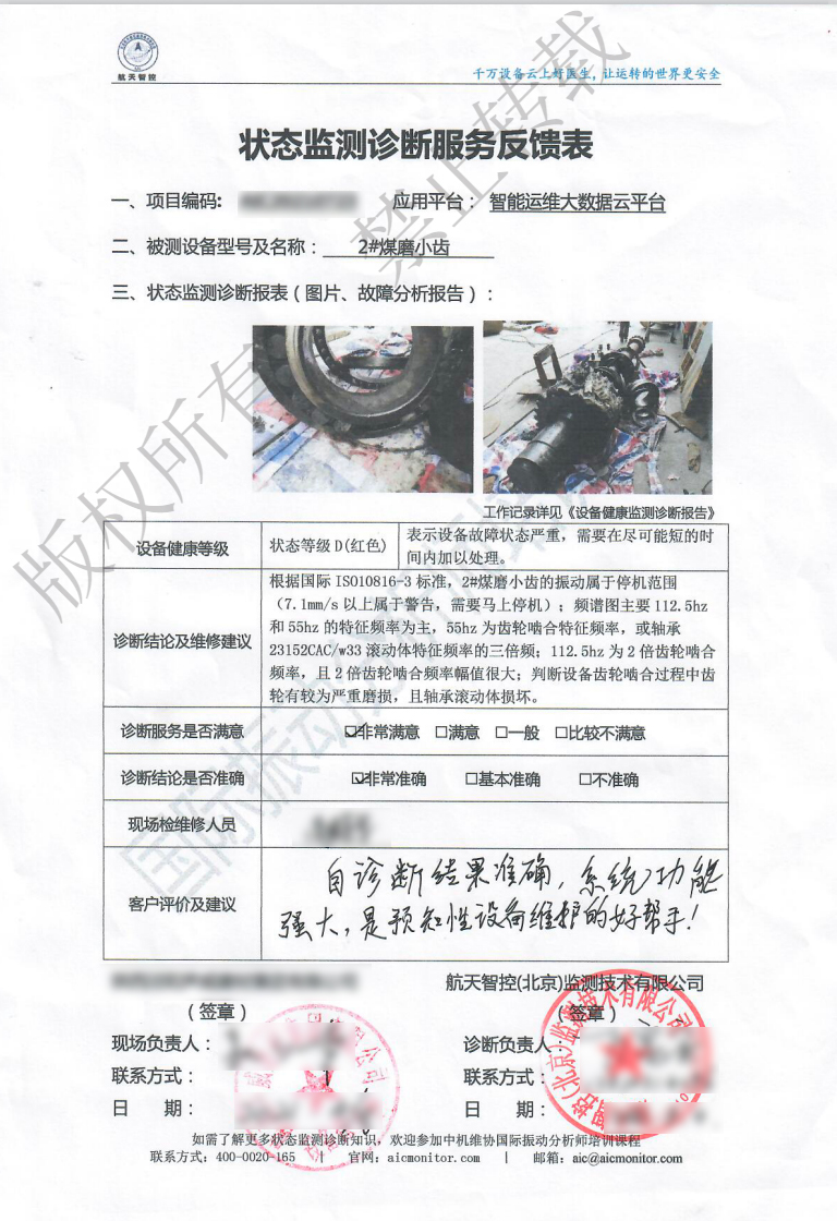 根据国际 IS010816-3标准,2#煤磨小齿的振动属于停机范围(7.1mm/s 以上属于警告,需要马上停机);频谱图主要以112.5hz和55hz的特征频率为主,55hz为齿轮啮合特征频率,或轴承23152CAC/w33滚动体特征频率的三倍频;112.5hz为2倍齿轮啮合频率,且2倍齿轮啮合频率幅值很大:判断设备齿轮啮合过程中齿轮有较为严重磨损,且轴承滚动体损坏。