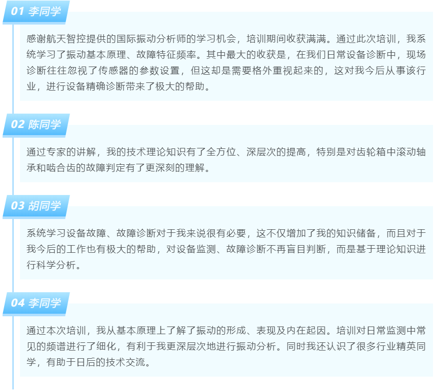 全程参加培训并通过测评的学员获得了“国际振动分析师II级证书”。该证书由中国机电装备维修与改造技术协会统一编号注册、网上公示,是从业者晋升、求职的有效证件。证书查询官网:http://www. camer.org.cn。