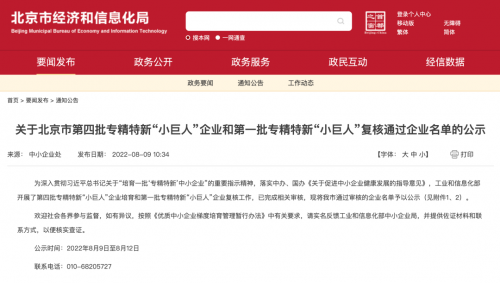 ▲北京市经济和信息化局公布本市第四批国家级专精特新“小巨人”企业公告及名单