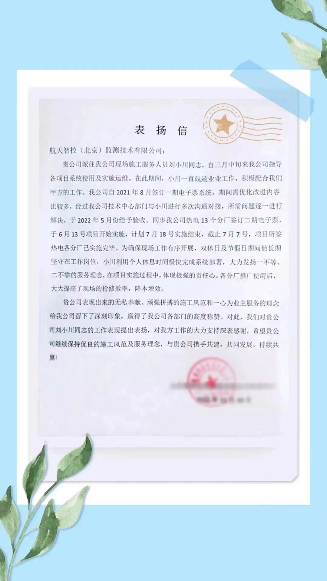 “这个项目能够圆满完成是整个项目组勠力同心的结果。收到表扬信,感觉自己的努力和付出得到客户的认可与肯定,内心非常喜悦。同时感谢航天智控提供了广阔的平台,让我有所计划,人生有所发展!”刘工这样描述获得表扬信后的心情。
