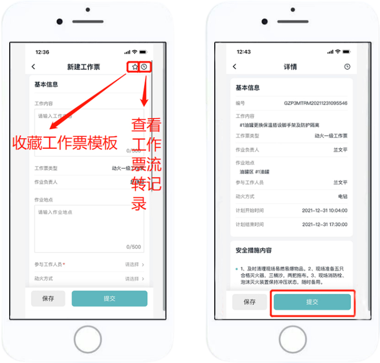 在新建工作票界面,可单独配置界面内容,支持输入、下拉框选择等方式,具有保存和收藏功能;票据提交可查阅流转记录,标准北京时间,精准记录流转环节。输入票据详情界面的提交内容,支持图片、视频、文档等附件格式。