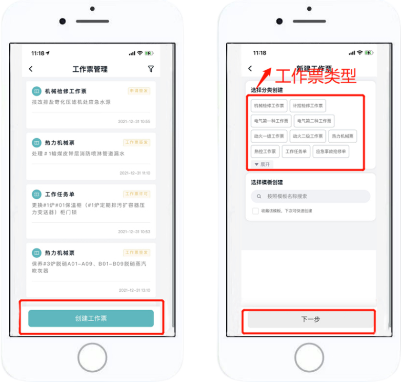 从工作票管理界面进入新建工作票界面,有多种票据类型可供选择,也可通过导入的模板快捷创建票据。