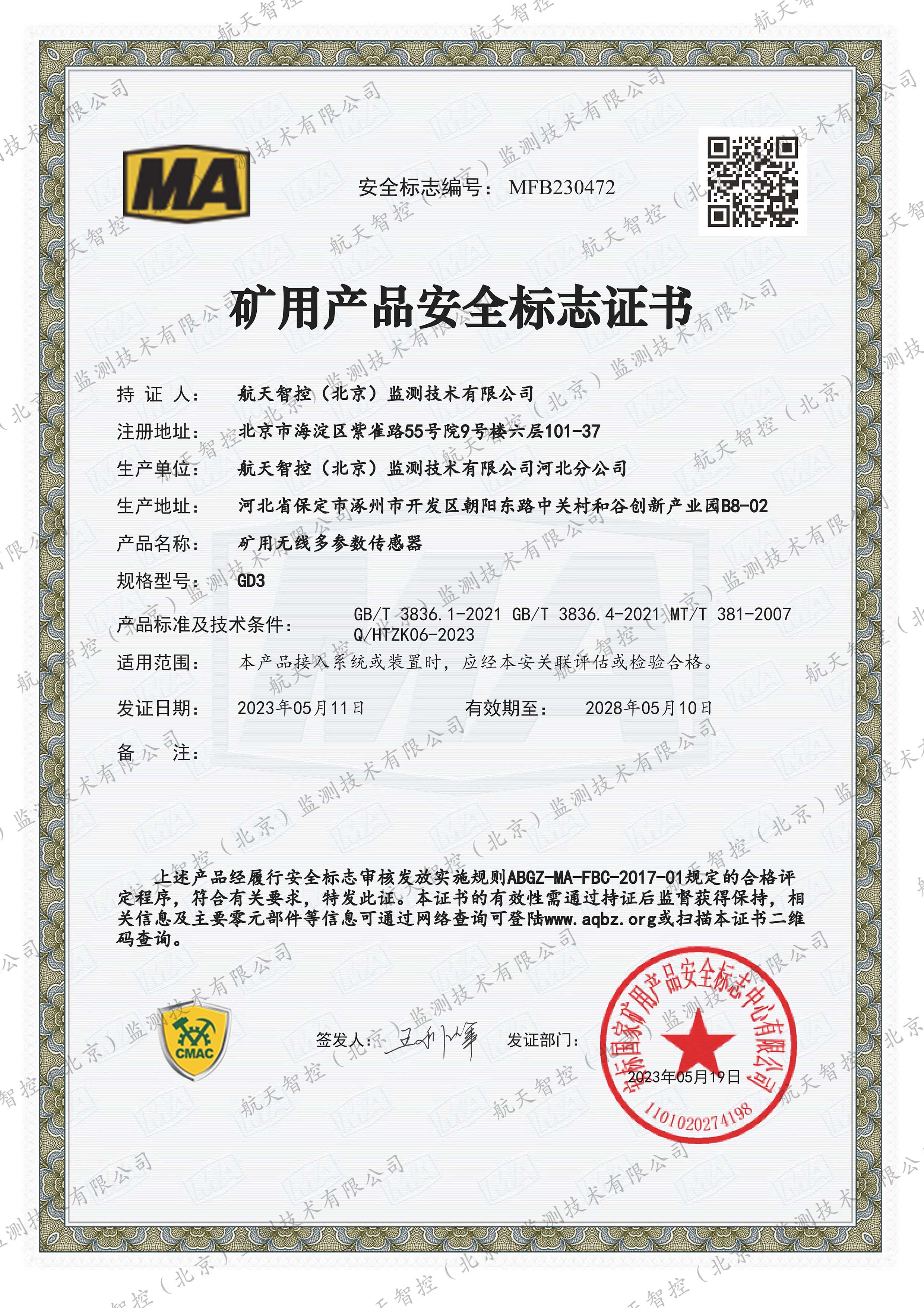 近日,“安标国家矿用产品安全标志中心”传来喜讯,由航天智控自主研发并生产的GD3矿用无线多参数传感器成功通过实验,荣获了安标国家中心颁发的矿用产品安全标志证书(MA证书)。这是航天智控又一款产品获得MA证书,加上此前的矿用机电设备故障监测装置、矿用隔爆兼本安型机电设备故障监测数据采集箱、矿用本安型数据采集器、矿用本安型无线振动温度传感器等,一共有多款产品获得MA证书,集中彰显了公司在业内领先的技术实力,进一步提升了航天智控品牌的口碑和影响力。