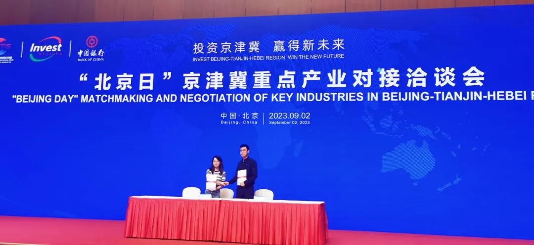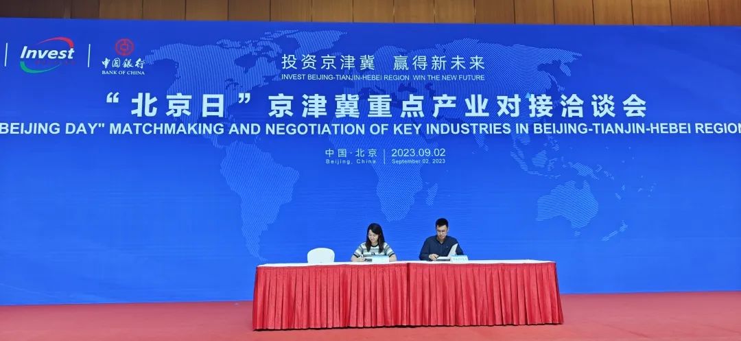 9月2日,由中国银行和北京市人民政府主办、北京市投资促进服务中心和中国银行北京市分行承办的2023“北京日”京津冀重点产业对接洽谈会(以下简称“对接会”)在国家会议中心举办。会上聚焦新一代信息技术、医药健康等重点领域,组织北京市级有关部门、各区经开区重点园区,天津、河北投资促进机构、重点产业园区,以及世界500强企业、产业龙头企业、创新创业企业、投资机构等进行对接洽谈。北京市副市长于英杰、天津市副市长李文海、河北省副省长金晖、中国银行副行长张小东出席活动。
