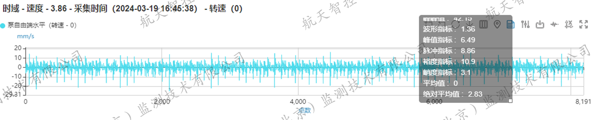 针对上述异常情况,航天智控诊断工程师对设备运行数据进行了深入剖析。从循环氨水泵驱动端与自由端的水平趋势图可见,泵两端振动值普遍维持在较高水平,并长时间超过预警阈值。波形图中冲击信号清晰可辨,峭度指标超过正常范围。此外,速度谱以及加速度谱的底噪普遍抬起,这些都表明轴承故障特征已进入较为明显的阶段。