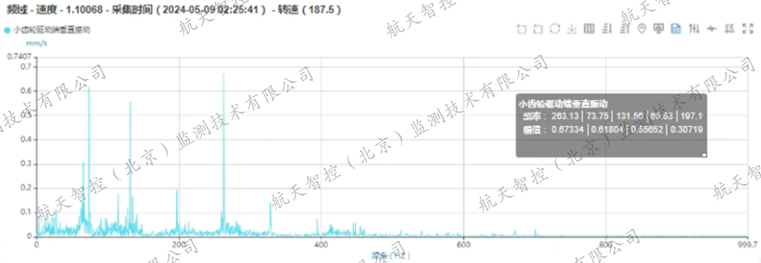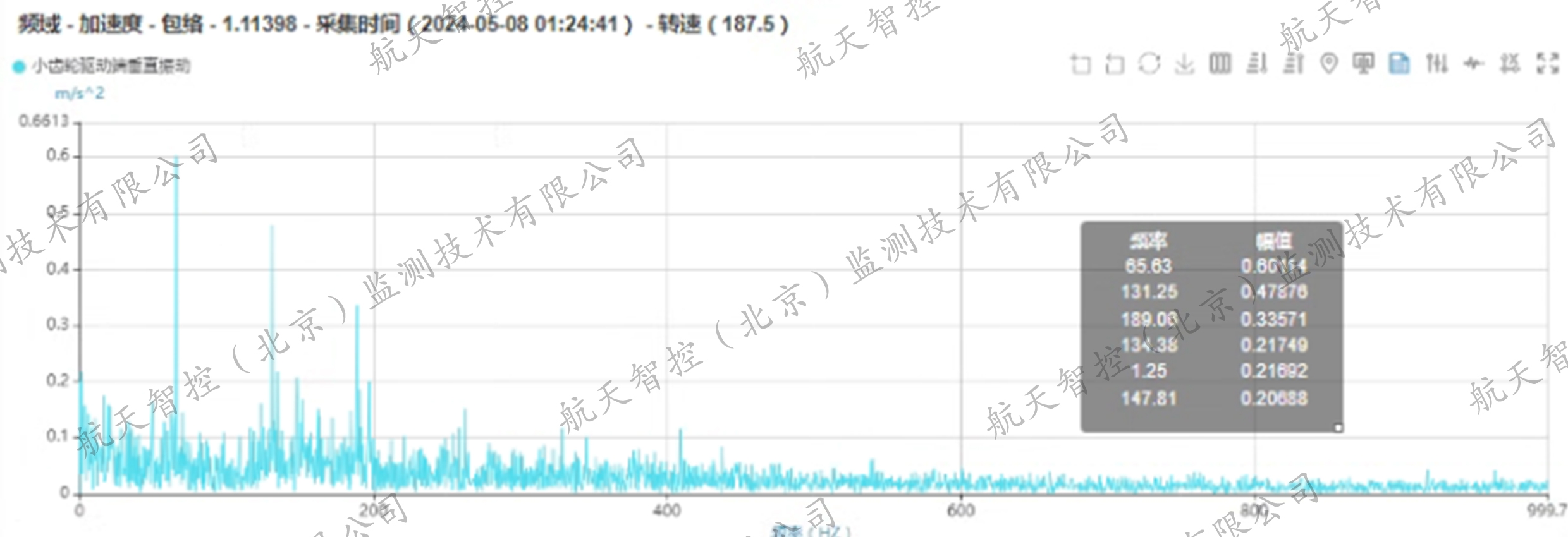 为精准定位问题根源,航天智控智能诊断团队进一步解析了小齿轮驱动端的垂直频谱图,结果表明在65.63Hz、131.56Hz、197.1Hz以及263.13Hz处出现了显著峰值,这恰好与小齿轮啮合频率及其二倍频、三倍频以及四倍频相接近。此外,小齿轮驱动端垂直加速度包络谱图也显示出整个通频带底噪明显,并存在小齿轮啮合频率及其倍频的异常信号。