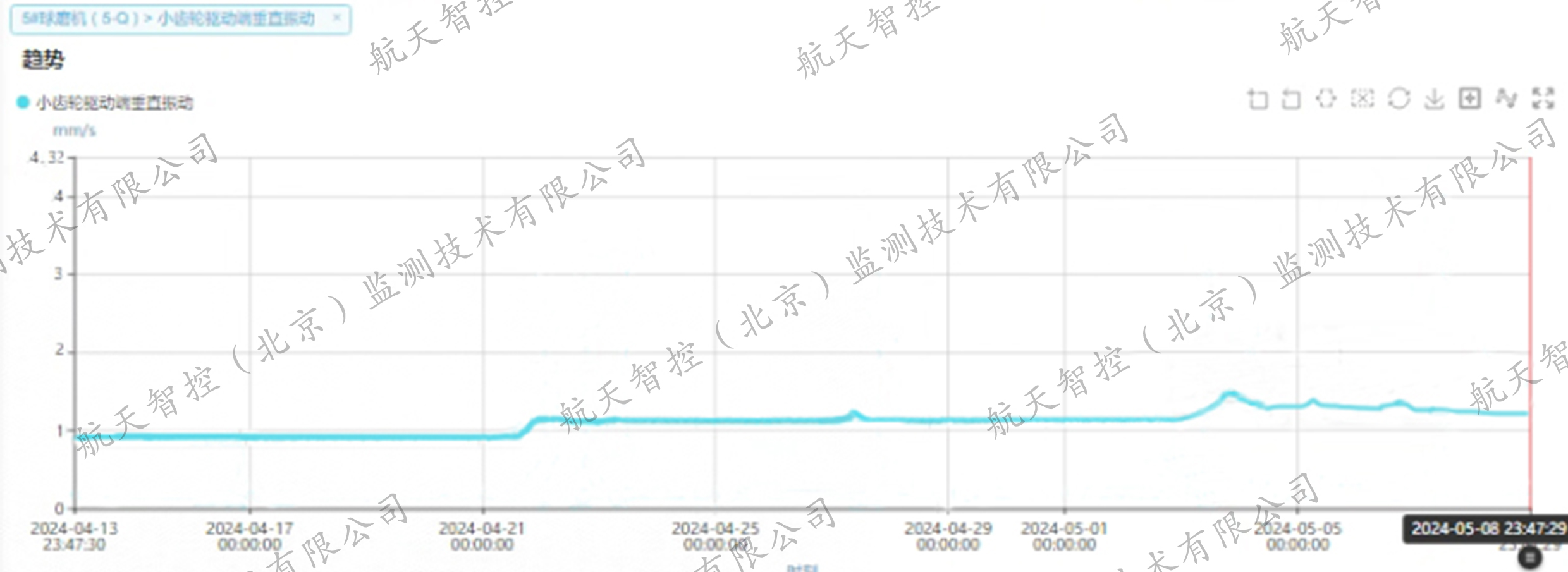 在日常的设备监测过程中,系统敏锐地捕捉到,5#球磨机的振动值4月中旬稳定在0.9mm/s左右,4月下旬约1.1mm/s,5月初部分振动值增长到1.3mm/s,这一连续且稳中有升的振动趋势,预示着设备可能存在潜在的运行异常,也触发了航天智控智能诊断团队的高度关注与深入分析。