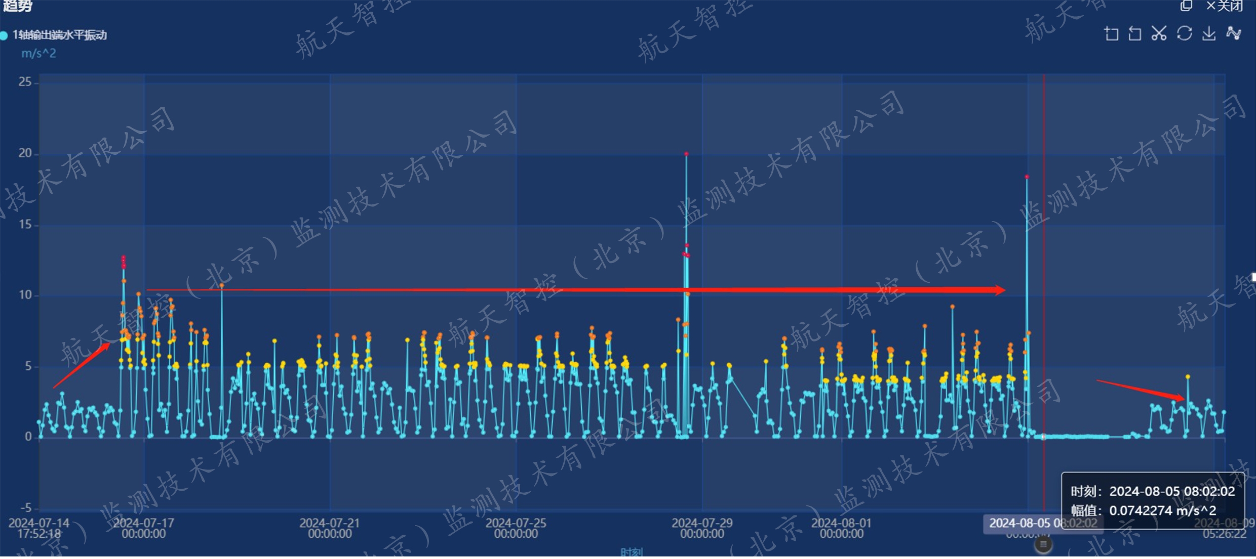面对复杂的设备运行数据,航天智控的智能诊断分析团队迅速介入,通过时域波形及频谱的精细解读,精准定位故障源头——一轴输出端轴承内圈存在明显的缺陷频率的冲击。