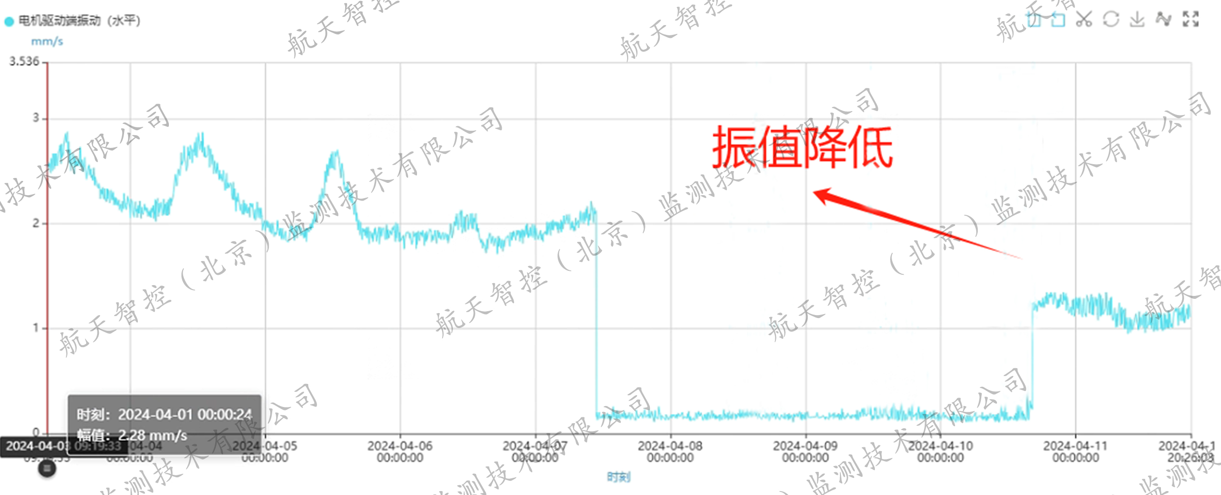 ▲重新对中校准后焦油采出泵电机驱动端水平振动趋势图