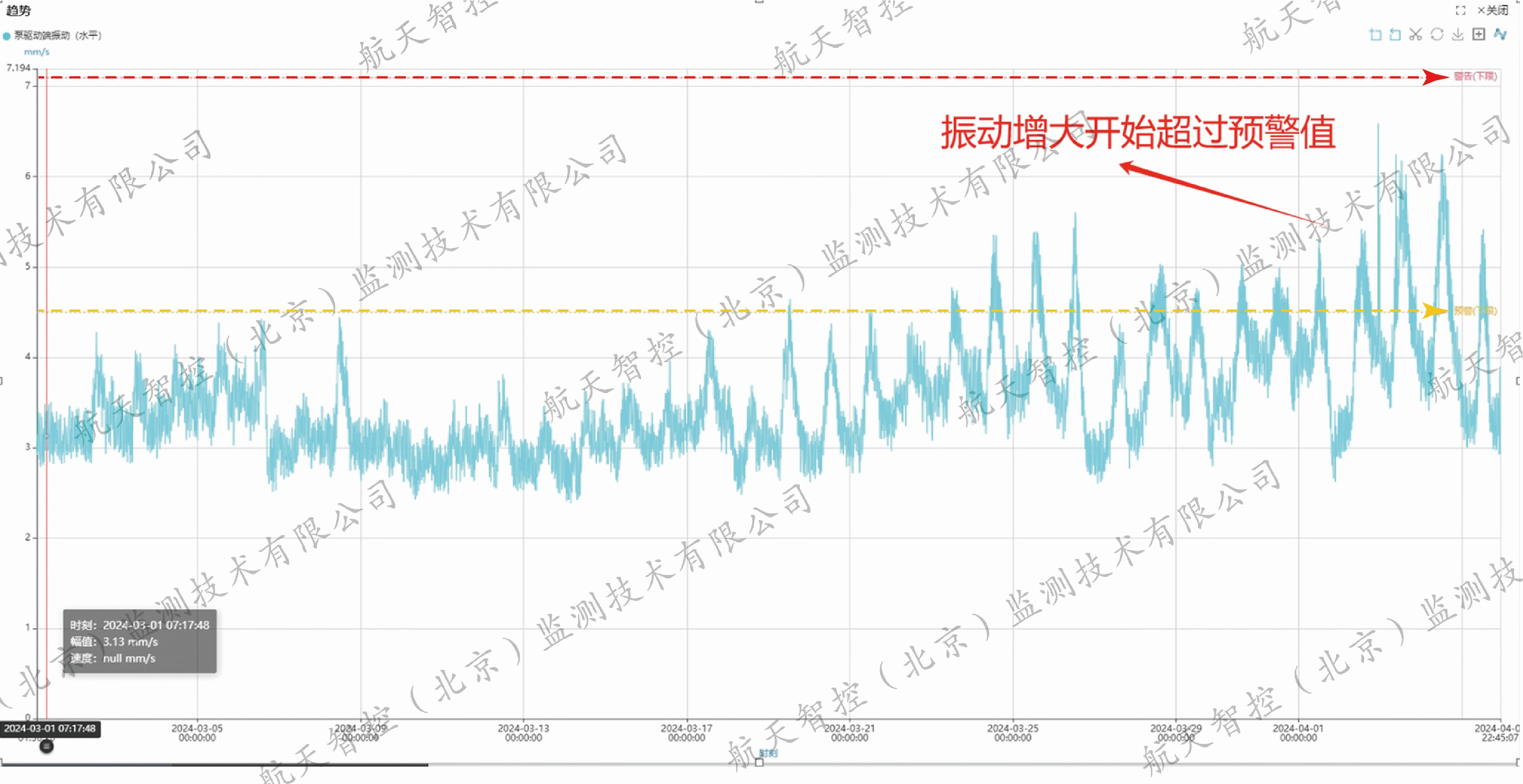 2024年3月中旬至4月初,生产线上的一台关键设备焦油采出泵的联轴器两端振动增大,特别是水泵输入端水平方向的振动增大明显,超过振动标准4.5mm/s,威胁到了生产的连续性和安全性。系统如同一位敏锐的“哨兵”,第一时间捕捉到了这一异常信号,并立即启动了智能报警机制。