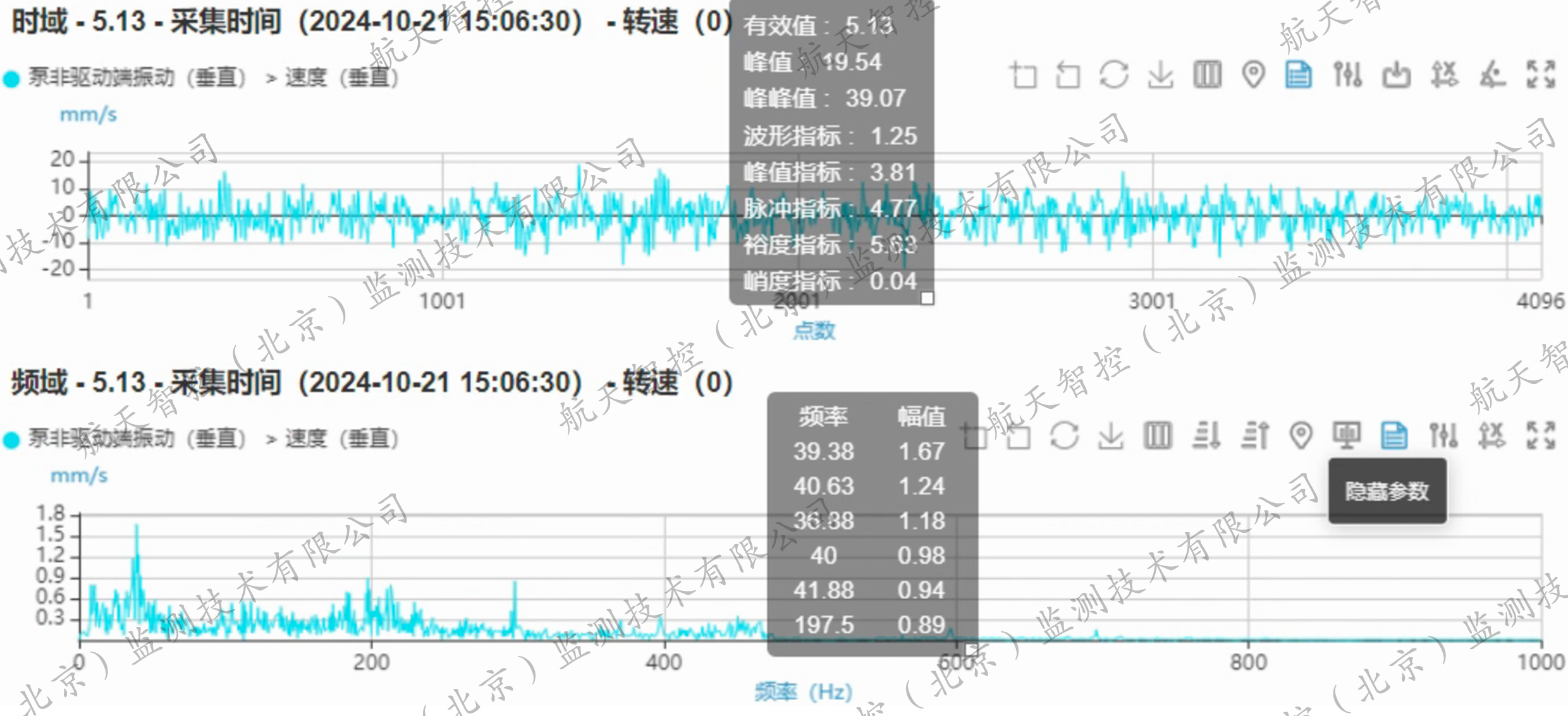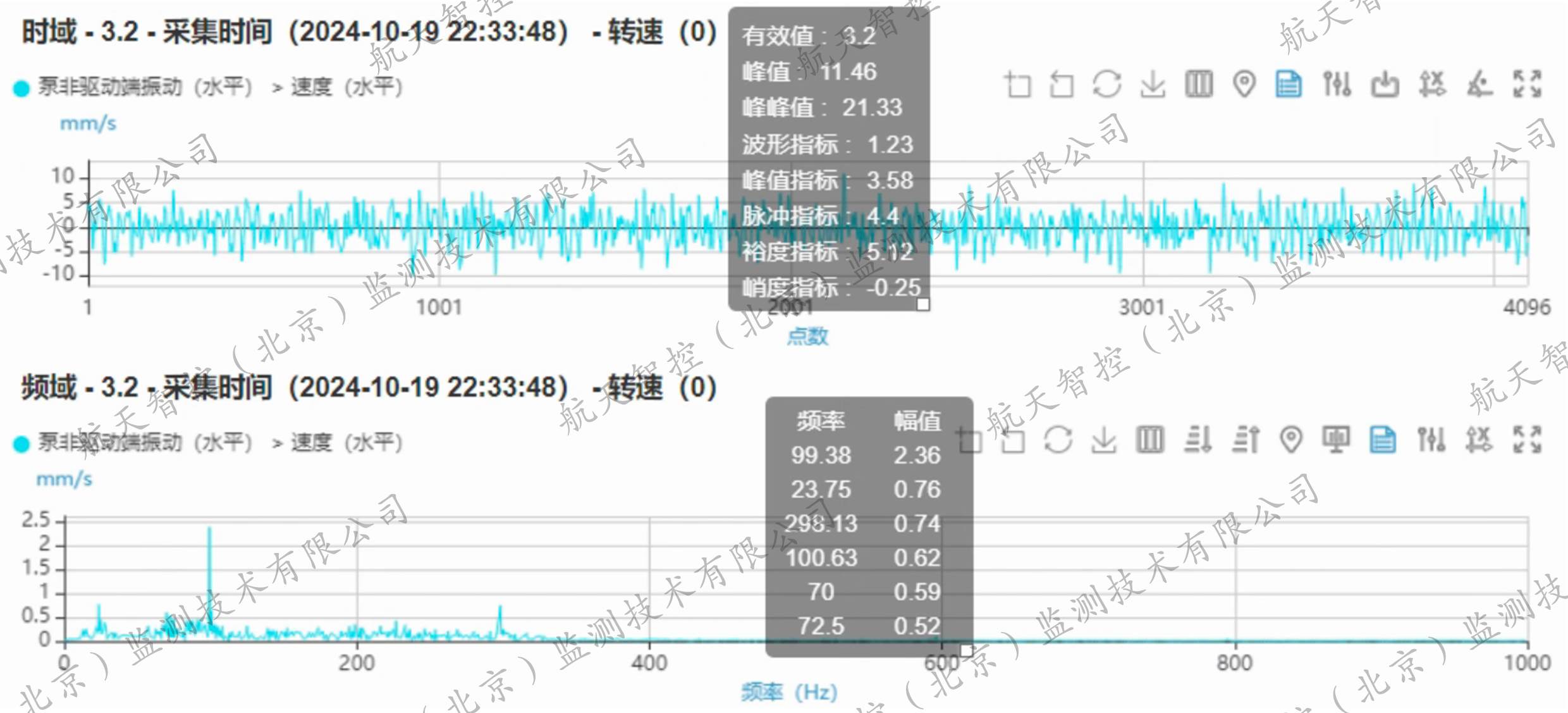 航天智控智能诊断团队迅速启动深度诊断。通过频谱分析,发现泵端整体振动变化明显,泵非驱动端水平速度频谱主要以99.38Hz(叶轮通过频率)为主,低频段底部噪声抬起,且加速度时域上存在非规律性冲击特征。同时,泵非驱动端垂直方向速度低频段整体噪声抬起明显,时域上规律性较差。