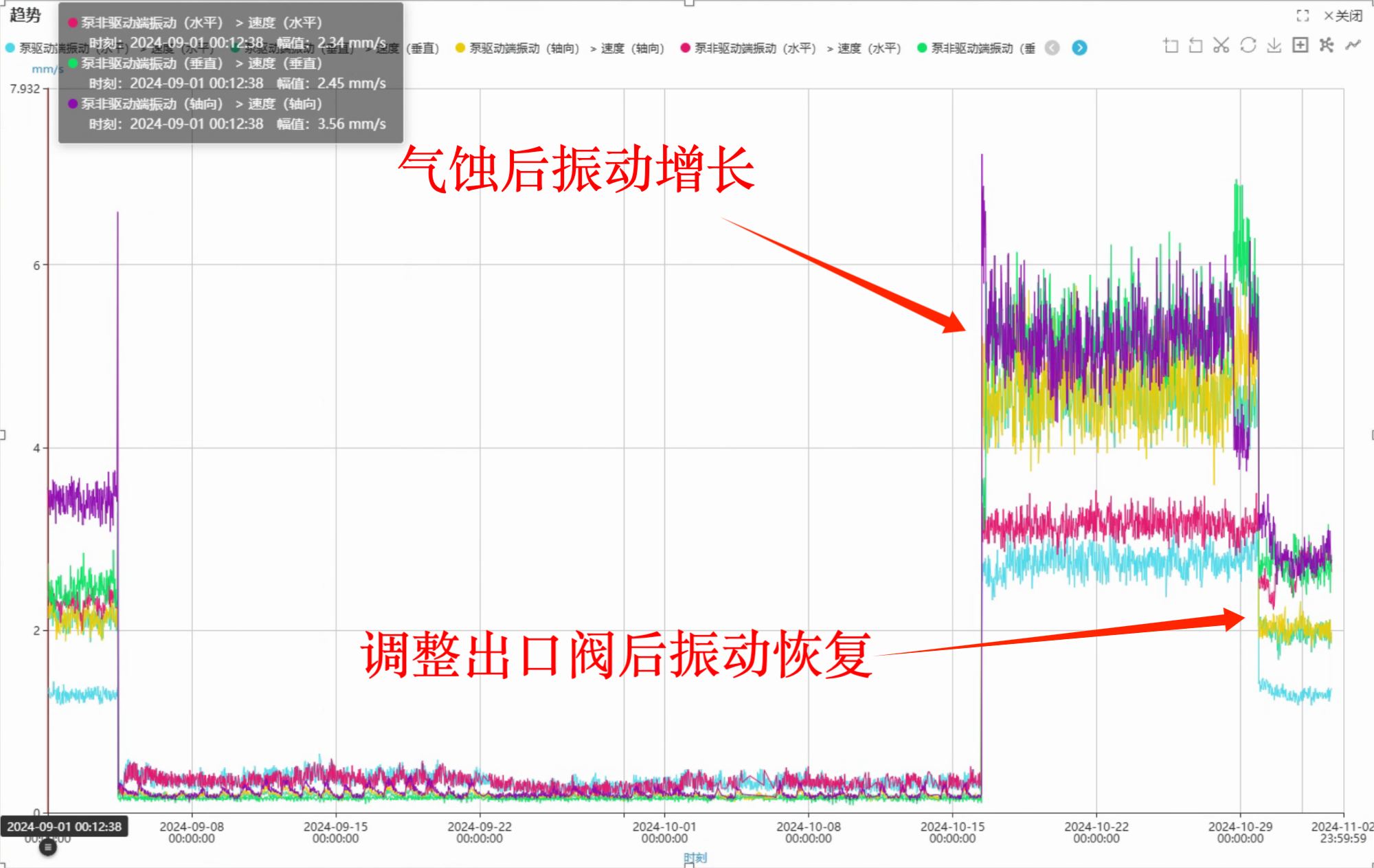 现场检修人员在设备泵端听到了明显的泵腔撞击声,确认气泡从低压入口形成后,在蜗壳高压处破裂,产生的冲击力对泵腔和叶轮造成侵蚀,这与前期诊断结论完全吻合。10月29日晚,检修人员根据航天智控的建议,调整了电动循环水泵出口阀开口大小,关小了出口流量。