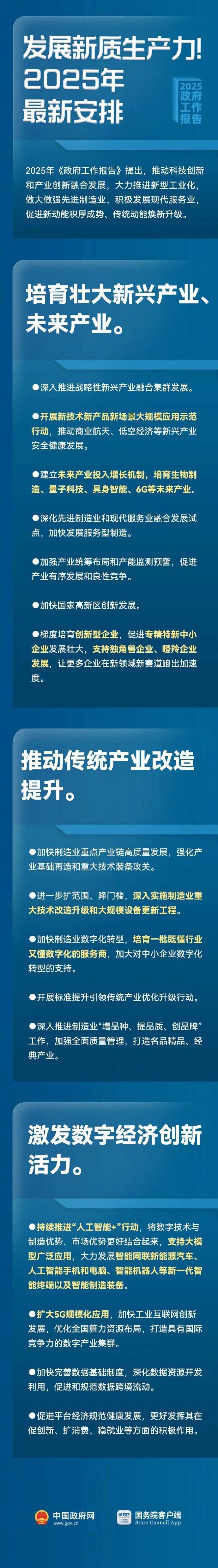 2025年《政府工作报告》的重点工作任务中提到“因地制宜发展新质生产力,加快建设现代化产业体系”;再次提出推动“人工智能+”行动;连续第八年提出“工业互联网”,指出要加快工业互联网创新发展;提出加快制造业数字化转型,培育一批既懂行业又懂数字化的服务商,加大对中小企业数字化转型的支持。