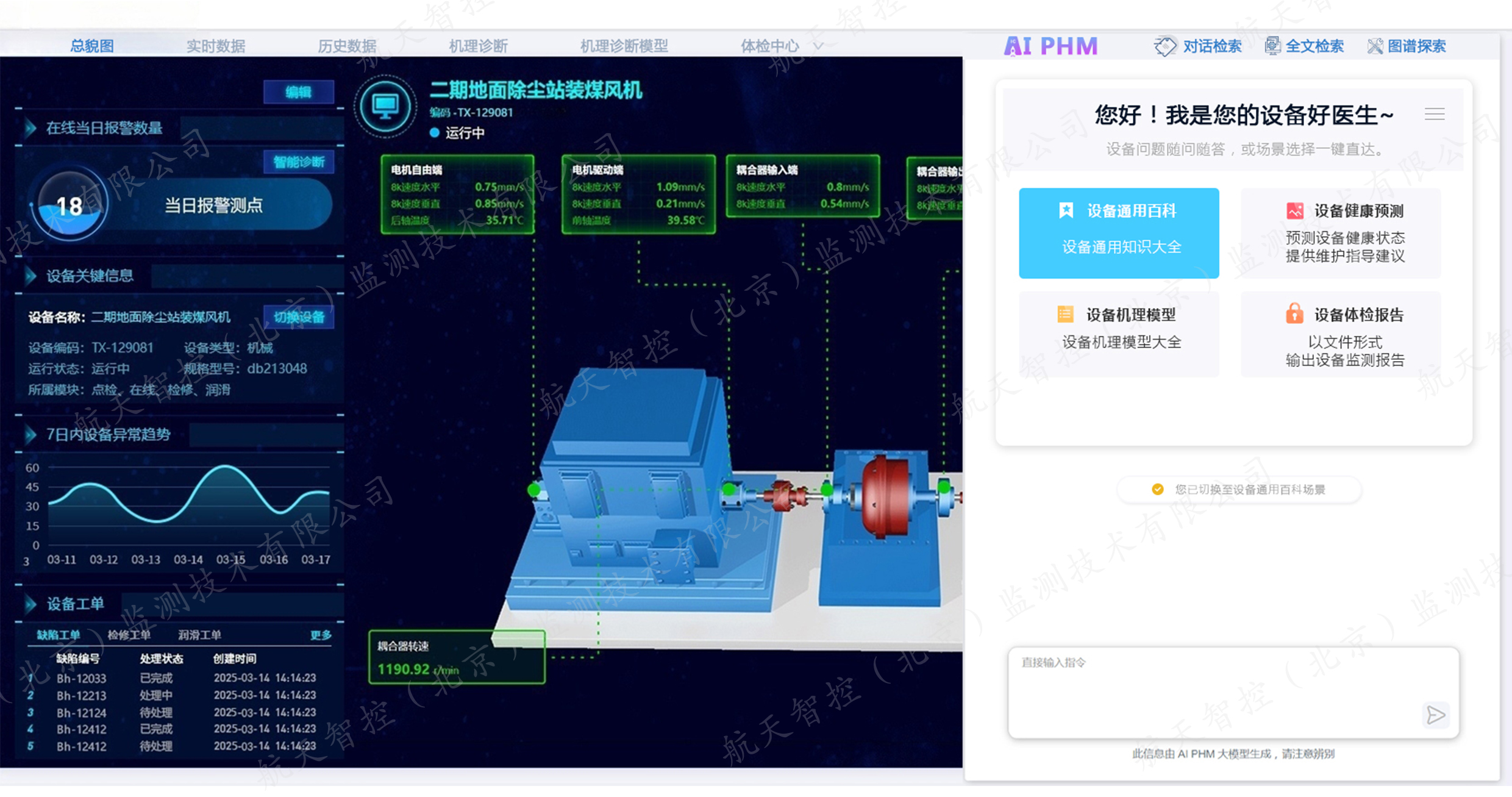 航天智控设备好医生AI PHM大模型构建了工业设备的"全科诊疗系统",通过融合运行参数(设备脉象)、振动图谱(设备心电图)、红外热像(设备体温)、维修工单(电子病历)、专家经验(行业知识库)等多维数据模态,为设备健康管理提供“全息体检+多科会诊”的一站式服务,避免单一问诊(单一数据维度)易漏检的局限,及早识别设备亚健康状态,实现精准诊疗。